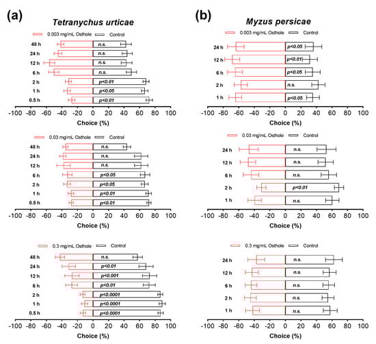 Antifeedant activity of osthole on T. urticae (a) and M. persicae (b) female adults. The Chi-squared test was used for statistical analysis. All experiments were reproduced 8 times. n.s. indicates not significant.