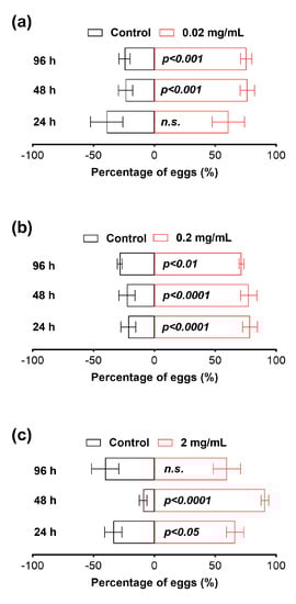 Oviposition attraction of 0.02 (a), 0.2 (b), and 2 (c) mg/mL osthole to B. dorsalis. The Chi-squared test was used for statistical analysis. All experiments were replicated five times. n.s. indicates not significant.