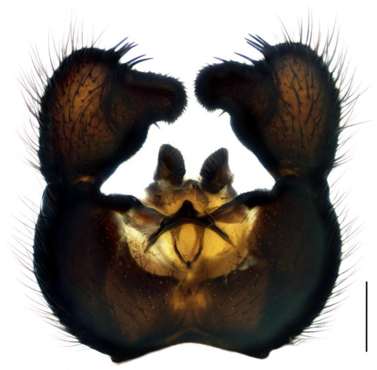 Hypopygium of Sciara analis, ventral view. Scale bar = 0.2 mm.