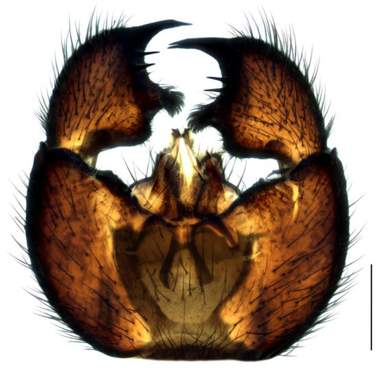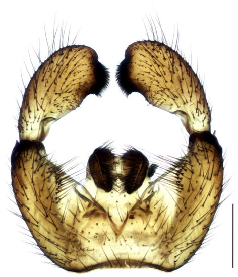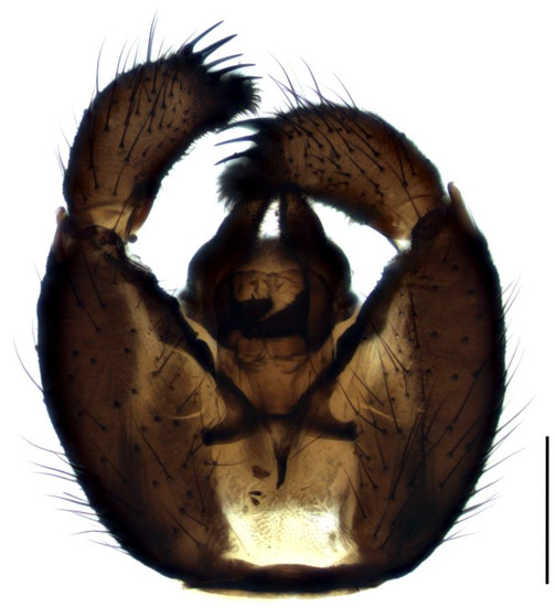 Diagnosis. Male adults reach 3.0–3.5 mm in length. Head brown. Eye bridge consists of two–there facet rows. Maxillary palpus and antennae light-brown. Flagellomeres with dense setae, as long as the flagellomeres width or a little longer, necks clearly defined and slightly separated, at least 0.13 of flagellomere’s length. Length/width of fourth flagellomere body = 2.71–2.86. Basal palpal segment with five–six bristles. Middle segment oval-elongated, shorter than basal, with more than 10 short bristles and one longer. Terminal segment thinner and longer than basal, with numerous bristles. Thorax brown with yellow membranous areas on mesonotum. Coxae and legs yellow with darker tarsi and hind tibia. Length of spur/width of tibia: p1 = 1.48–1.69, p2 = 2.13–2.43 and p3 = 1.98–2.09. Length of metatarsus/length of tibia: p1 = 0.54–0.55, p2 = 0.46 and p3 = 0.44–0.46. Wing 2.5 mm long (3.0–3.5 mm [4]) and 1.0 mm wide, width/length of wing = 0.40. Wing membrane slightly smoky, with numerous macrotrichia at the apical half. R1 long, falls into C in front of the base of M-fork, R1/R = 1.40; x bare, shorter than y, y with one macrotrichia near the base of stM or bare, x/y = 0.97; stM shorter than M-fork, weakly recognizable, with about 10 macrotrichia, stM/M-fork = 0.84; M1 and M2 with numerous macrotrichia; stCuA short, stCuA/x = 0.61; CuA1 and CuA2 with macrotrichia; c/w = 0.67. Halter brown. Hypopygium (Figure 3) brown. Gonocoxite wider than high, as long as gonostylus, with long bristles and deep intergonocoxal bare light-brown membrane. Gonostylus bean-shaped, bulbous at the base, extended ventrally to the tip to form a broadly rounded lobe, covered with short dense bristles. On the dorsal side of gonostylus, inside at the base of the ventral lobe, is a clearly projecting hump with a group of three–six long black spines (one of them sometimes slightly shorter and more isolated standing at the upper base of the hump [27]); one or two more shorter spines are ventrally, on the apex of lobe.