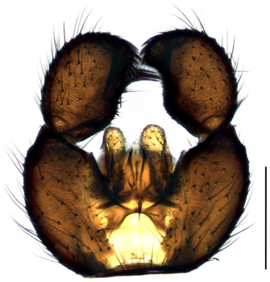 Hypopygium of Sciara incerta, ventral view. Scale bar = 0.2 mm.