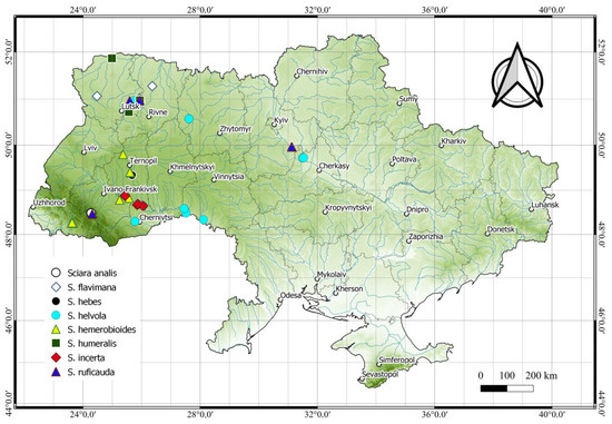 Later, Gerbachevskaja showed four Sciara species for Crimea—S. analis, S. hemerobioides, S. ruficauda and S. humeralis [18]. Krivosheina and Mohrig reported the Zakarpatska region as a new locality for S. hemerobioides [19]. Thus, according to the literature, five Sciara species have been recorded in four regions of the modern territory of Ukraine.