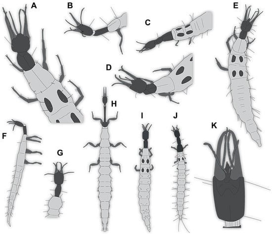Figure 1. Nevrorthidae; fossil and extant immature specimens from the literature, interpretative drawings. (A,C–E,H) Fossil specimens. (B,F,G,I–K) Extant specimens. (A). Specimen 6634 preserved in Baltic amber; anterior region of the body in dorsal view; from []. (B). Specimen 6635; Nevrorthus (“Neurorthus”) apatelius; anterior region of the body in oblique dorsal view; from []. (C). Specimen 6636; Rophalis relicta preserved in Baltic amber; anterior body region in dorso-lateral view; from []. (D). Specimen 6637; anterior body region in dorsal view; from []. (E). Specimen 6638 preserved in Baltic amber; dorsal view; from []. (F,G). Specimen 6639; Nevrorthus fallax; from []. (F). Overview. (G). Anterior region in dorsal view. (H). Specimen 6640; Girafficervix baii; dorsal view; from []. (I). Specimen 6642; dorsal view; from https://friendsofrietvlei.co.za, accessed on 5 September 2023. (J). Specimen 6643; dorsal view; from https://www.waterbugblitz.org.au, accessed on 5 September 2023. (K). Specimen 6644; head in ventral view; from https://www.mdfrc.org.au, accessed on 5 September 2023.