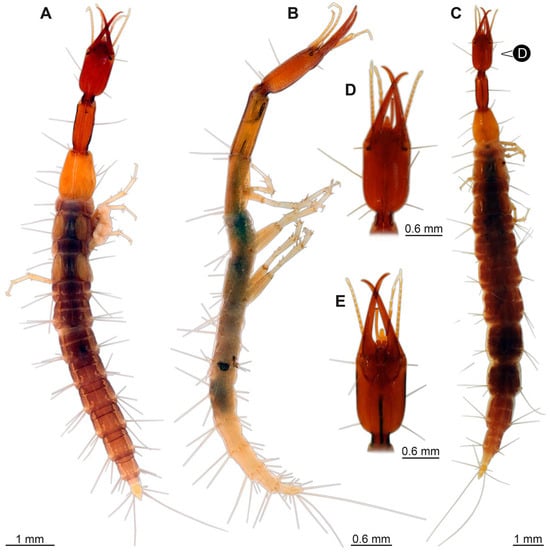 Figure 3. Nevrorthidae (Austroneurorthus); extant immature specimens. (A). Specimen 49; dorsal view. (B). Specimen 6650; lateral view, right. (C). Specimen 6651; dorsal view. (D). Close-up of dorsal side of the head of (C). (E). Close-up of ventral side of the head of specimen 6651.