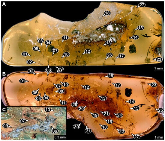 Figure 4. Nevrorthidae; fossil larvae preserved in Baltic amber; overview of large piece (PED 0871) with numerous specimens marked by numbers, ring light. (A). Side 1. (B). Side 2. (C). Close-up of some more tightly clustered specimens.