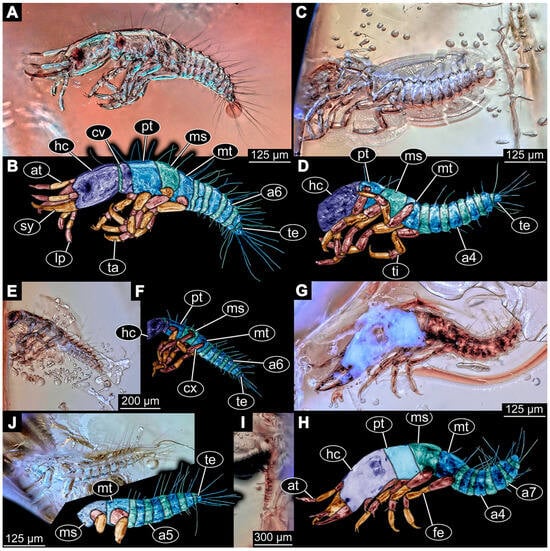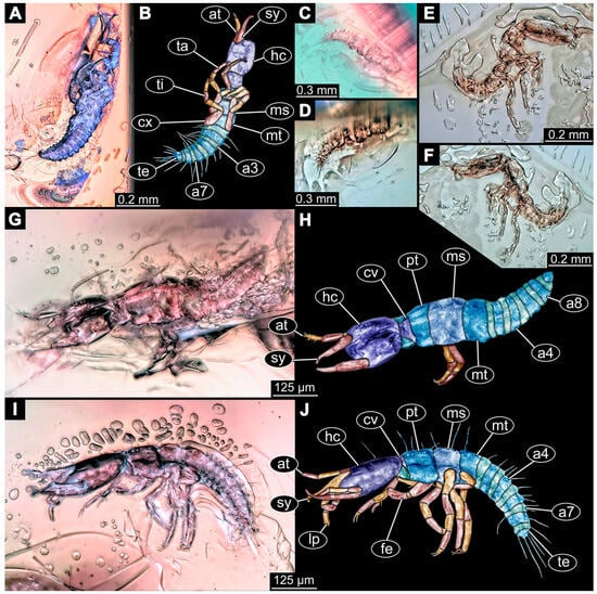 Figure 5. Nevrorthidae; fossil larvae preserved in Baltic amber; PED 0871, continued. (A–D). Specimen 6653 (specimen 2). (A). Ventral view. (B). Colour-marked version of (A). (C,D). Dorsal view. (E,F), Specimen 6652 (specimen 1). (E). Lateral view, right. (F). Lateral view, left. (G,H), Specimen 6654 (specimen 3). (G). Dorsal view. (H). Colour-marked version of (G). (I,J). Specimen 6655 (specimen 4). (I). Lateral view, left. (J). Colour-marked version of (I). (A,C,G,I). Cross-polarised light. (D–F). Ring light. Abbreviations: a1–7 = abdomen segments 1–7; at = antenna; cv = cervix (neck); cx = coxa; fe = femur; hc = head capsule; lp = labial palp; ms = mesothorax; mt = metathorax; pt = prothorax; sy = stylet; ta = tarsus; te = trunk end; ti = tibia.