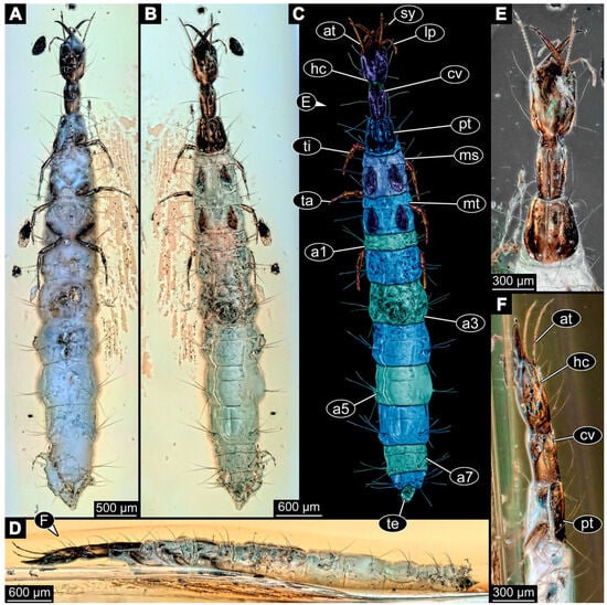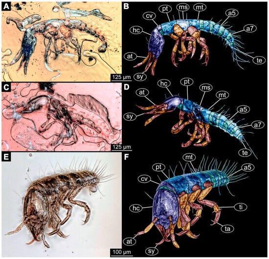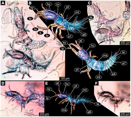 Figure 6. Nevrorthidae; fossil larvae preserved in Baltic amber; PED 0871, continued, cross-polarised light. (A–C). Specimen 6657 (specimen 6, lower one) and specimen 6658 (specimen 7, upper one). (A). Dorsal view. (B). Colour-marked version of (A). (C). Ventral view, image flipped. (D–F). Specimen 6656 (specimen 5). (D). Lateral view, right, image flipped. (E). Colour-marked version of (D). (F). Lateral view, left. Abbreviations: a1–7 = abdomen segments 1–7; at = antenna; cv = cervix (neck); fe = femur; hc = head capsule; lp = labial palp; ms = mesothorax; mt = metathorax; pt = prothorax; sy = stylet; ta = tarsus; te = trunk end; ti = tibia.