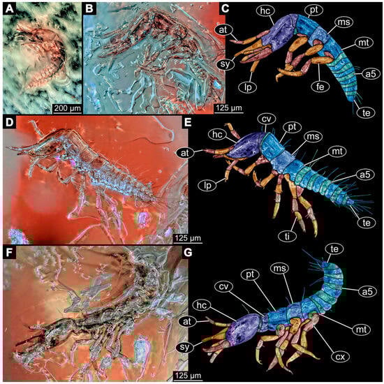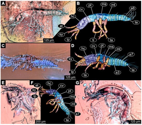 Figure 7. Nevrorthidae; fossil larvae preserved in Baltic amber; PED 0871, continued. (A,B). Specimen 6659 (specimen 8). (A). Lateral view, left. (B). Colour-marked version of (A). (C,D), Specimen 6660 (specimen 9). (C). Ventral view. (D). Colour-marked version of (C). (E,F). Specimen 6661 (specimen 10). (E). Lateral view, right, image flipped. (F). Colour-marked version of (E). (G). Specimen 6662 (specimen 11), lateral view, left. (A,E,G). Cross-polarised light. (C). Ring light. Abbreviations: a1–8 = abdomen segments 1–8; at = antenna; cv = cervix (neck); hc = head capsule; lp = labial palp; ms = mesothorax; mt = metathorax; pt = prothorax; sy = stylet; ta = tarsus; te = trunk end; ti = tibia.