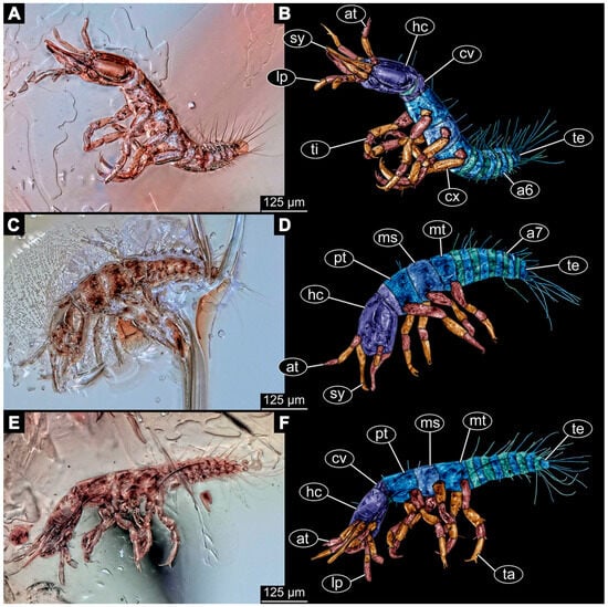 Figure 8. Nevrorthidae; fossil larvae preserved in Baltic amber; PED 0871, continued, images flipped. (A,B). Specimen 6663 (specimen 12). (A). Lateral view, right. (B). Colour-marked version of (A). (C,D). Specimen 6664 (specimen 13). (C). Lateral view, right. (D). Colour-marked version of (C). (E,F), Specimen 6668 (specimen 17). (E). Lateral view, right. (F). Colour-marked version of (E). (A,C). Cross-polarised light. (E). Ring light. Abbreviations: a1–7 = abdomen segments 1–7; at = antenna; cv = cervix (neck); hc = head capsule; lp = labial palp; ms = mesothorax; mt = metathorax; pt = prothorax; sy = stylet; ta = tarsus; te = trunk end; ti = tibia.