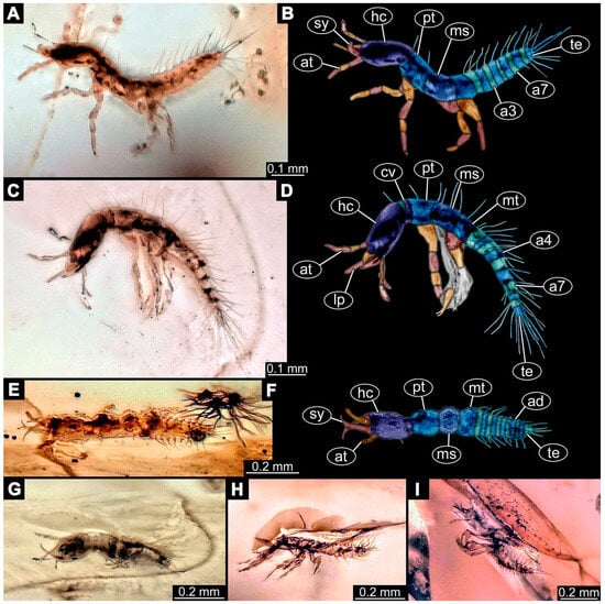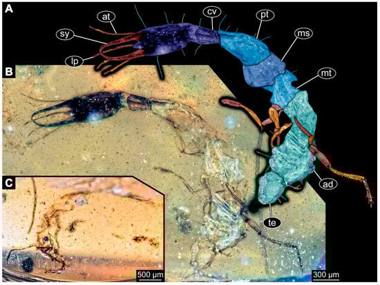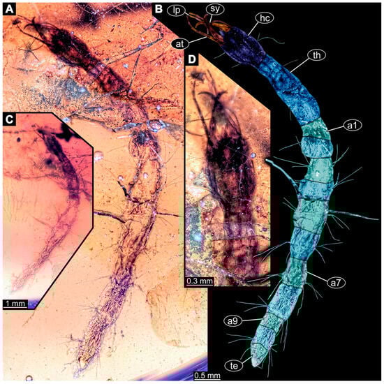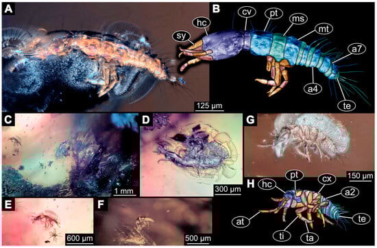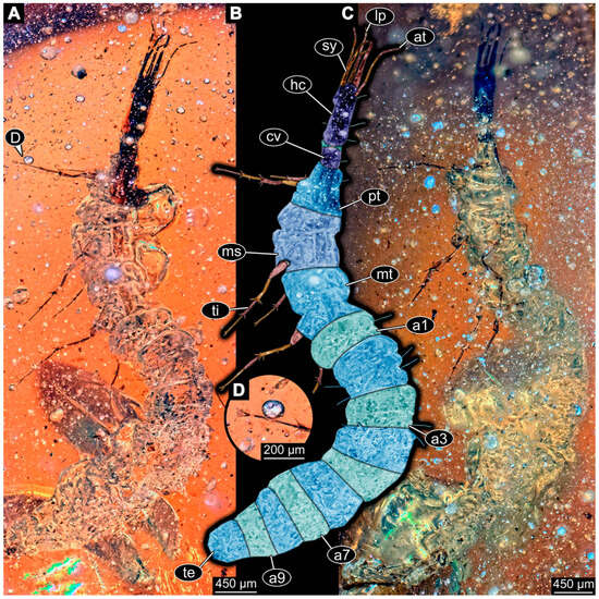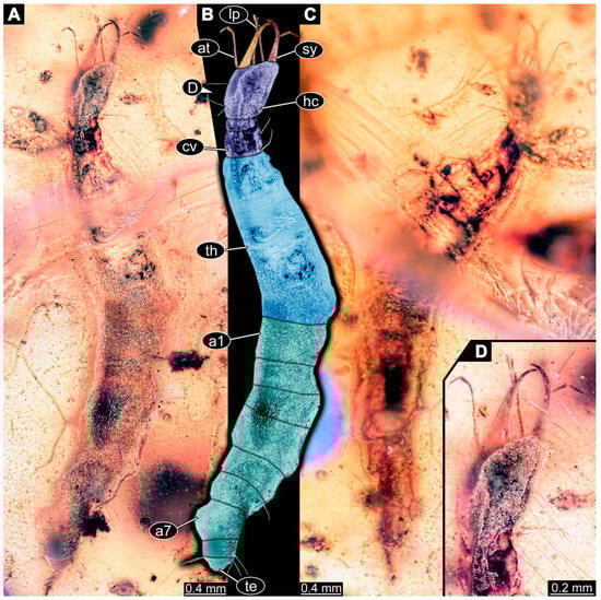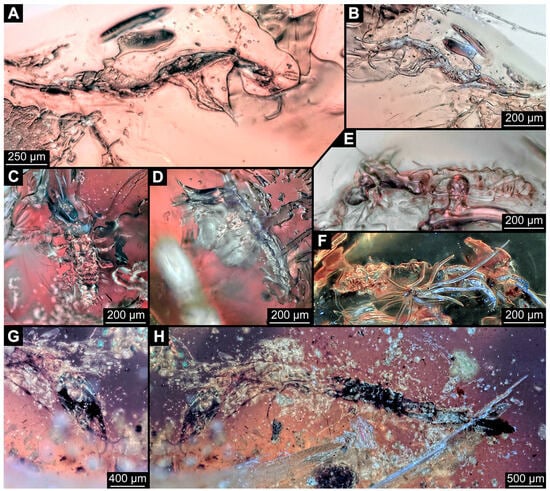 - Specimen 6659 (PED 0871 spec 8) is only accessible from left lateral side of the body (Figure 7A,B). It is preserved in the same amber piece as specimens 6652–6658. The specimen shows the overall slender morphology known for older larvae of Nevrorthidae in the anterior region, but especially the posterior trunk appears much less slender, the segments of the abdomen are extremely short. Overall outline is a bit obscured by tiny bubbles, but still accessible. Head with one antenna, both stylets, and labial palps. Antenna is elongated, quite slender, and tapering distally, subdivided into three elements. Stylets are elongate and tapering distally, but mostly cover each other. Labial palps are slightly shorter than antenna, subdivided into at least three elements apparent, proximal region not accessible. Trunk appendages with five major elements (coxa, trochanter, femur, tibia, tarsus; Figure 7B), well preserved, but they are entangled with each other, partly obscuring subdivisions and details. Coxa is tubular and elongated; trochanter not accessible; femur tubular and slightly shorter than coxa; tibia similar; tarsus quite slender, elongate and distally with a pair of claws. The thorax is clearly subdivided into pro-, meso-, and metathorax with a short cervix anteriorly. Only at the trunk end are a few elongate setae visible. The insertion areas are obscured.