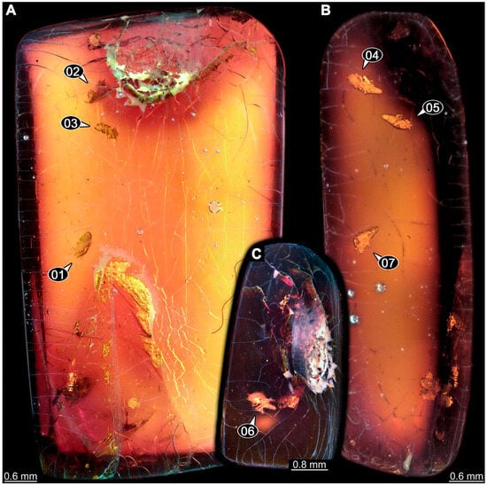 - Weitschat, W.; Wichard, W. Atlas der Pflanzen und Tiere im Baltischen Bernstein; Friedrich Pfeil: Munich, Germany, 1998. [Google Scholar]