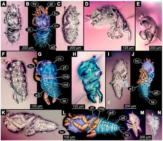 If possible, specimens were photographed from both sides. Illumination was cross-polarised co-axial light or unpolarised low-angle ring light with a black or white background. The images with the best contrast were then optimised with Adobe Photoshop 2023 (Version 24.0.0, Adobe, San José, CA, USA). All visible structures of the larvae were colour-marked and labelled. Corresponding structures were given the same colours.