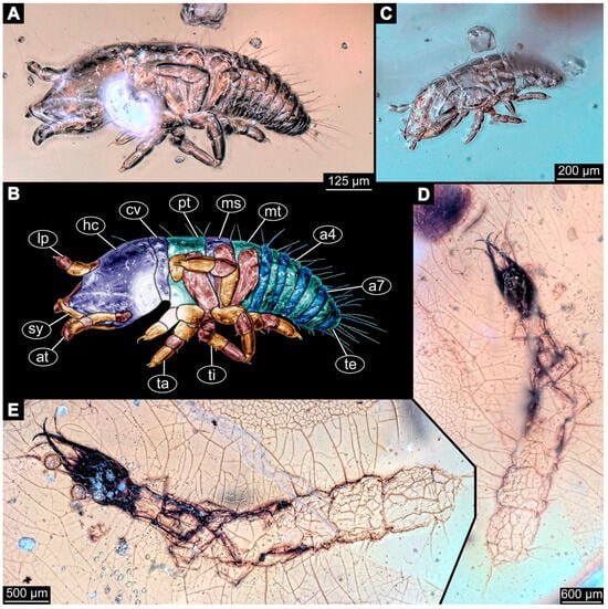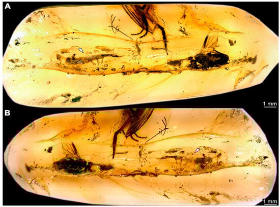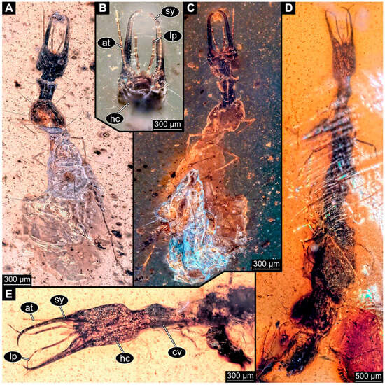 New directly studied material came from various sources. Fossil specimens are all preserved in amber, with a total of 69 specimens in 23 pieces, of which 55 specimens (in nine pieces) are preserved in Eocene Baltic amber (about 40–35 million years old) and 14 specimens (in 14 pieces) are preserved in Cretaceous Kachin amber, Myanmar (about 100 million years old [,,]). Baltic amber pieces come from the collections of the Natural History Museum Denmark, Copenhagen (NHMD), the Senckenberg Naturmuseum Frankfurt (SMF), the Palaeo-Evo-Devo Research Group Collection of Arthropods, Ludwig-Maximilians-Universität München (PED), and the collection of two of the authors (CH and HWH: CCHH). Kachin amber pieces come from the collections of the Palaeo-Evo-Devo Research Group Collection of Arthropods, Ludwig-Maximilians-Universität München (PED), and the collections of two of the authors (PM: BUB; TW Weiterschan BuB). Specimens from the PED collection were purchased from Jonas Damzen, Vilnius (www.amberinclusions.eu, accessed on 5 September 2023), and on ebay.com (accessed on 5 September 2023) from three traders: burmite-miner, macro-cretaceous, and rmvveta (see also www.ambertreasure4u.com, accessed on 5 September 2023). Extant specimens, seven in total, are part of the Australian Museum Entomology Collection, Sydney.