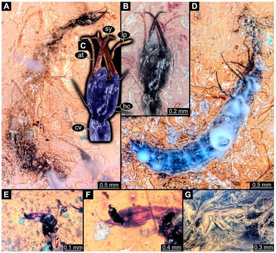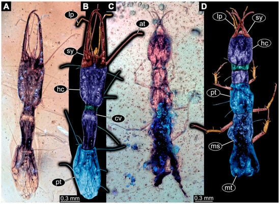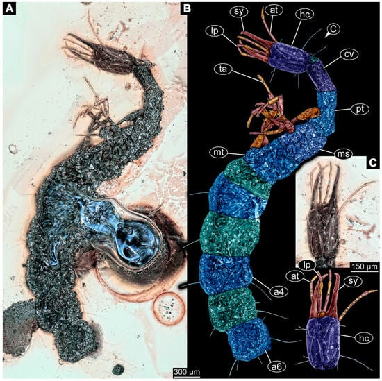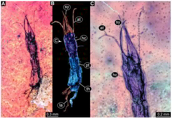 - Specimen 6650 (accession number nsw_epa_MANN16_batar_ck_220499; in the same vial as specimen 6647–6649) is well accessible (Figure 3B); it likely represents a final larval stage. The specimen was collected during the NSW EPA NSW EPA-MRHI survey, MANN-16, in the tributary of Batar Creek, New South Wales, Australia (31°40′57″S, 152°40′7″ E), on 22 April 1999 by N. Waddell. Head with antennae, stylets, and labial palps. Antennae are elongated, subdivided into several elements (about 14). Stylets are curved and tapering distally. Labial palps are subdivided into at least four elements apparent, proximal region not well accessible. Trunk appendages with five major elements (coxa, trochanter, femur, tibia, tarsus; Figure 3B), well preserved, but they are entangled with each other, partly obscuring subdivisions and details. Coxa is tubular and elongated; trochanter not accessible; femur similar to coxa, but shorter; tibia similar to femur, but a bit longer and wider; tarsus similar to tibia, but shorter and tapering distally with a pair of claws. Thorax is subdivided into pro-, meso-, and metathorax, with a long cervix anteriorly. Abdomen with at least 10 units. Prominent setae arise from the trunk appendage elements. Femur and tibia are distally with a set of four to six setae each. Few, less prominent setae also apparent further proximally, no clear pattern apparent. Trunk segments with prominent long setae. These arise close to the posterior end of each segment and appear to form a kind of ring around the segment.