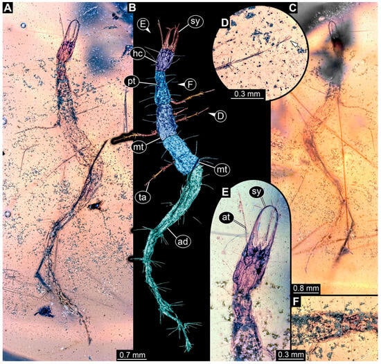 - Specimen 6661 (PED 0871 spec 10) is only accessible from the right lateral side of the body (Figure 7E,F). It is preserved in the same amber piece as specimens 6652–6660. The specimen shows the overall slender morphology known for older larvae of Nevrorthidae in the anterior region, but especially the posterior trunk appears much less slender, the segments of the abdomen are extremely short. Despite the Verlumung, the overall outline is well accessible. Head with antennae, stylets, and labial palps. Stout antennae subdivided into three elements. The stylets taper distally. They are straight proximally with a broad proximal region, but a bit curved more distally. Labial palps look similar to the antennae, subdivided into at least three elements apparent, proximal region not accessible. Trunk appendages with five major elements (coxa, trochanter, femur, tibia, tarsus; Figure 7D), well preserved, but they are entangled with each other, partly obscuring subdivisions and details. The thorax is clearly subdivided into pro-, meso-, and metathorax with a short cervix anteriorly. Only a few setae arise at the ten abdomen units. The insertion areas are mostly obscured by Verlumung.