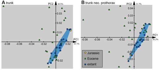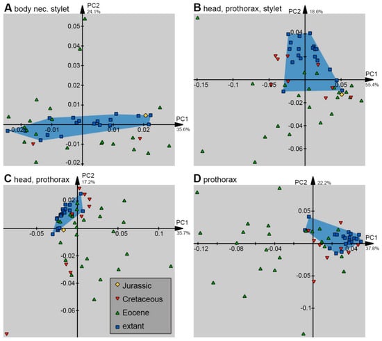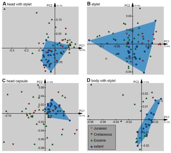 In total, 10 different combinations of shapes were analysed: (1) the head capsule and stylet, (2) the stylet, (3) the head capsule, (4) the head capsule, stylet, and trunk, (5) the head capsule and trunk, (6) the head capsule, stylet, and prothorax (including the neck), (7) the head capsule and the prothorax, (8) the prothorax, (9) the trunk, and (10) the trunk without the prothorax.