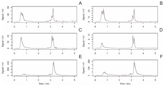 The average chromatograms of chemical substances from the surface of fibers at various settings of the absorbance detector (AD) and fluorescent (FD) detector. The settings of the detectors were as follows: (A)—AD 215 nm, (B)—AD 250, (C)—AD 280 nm, (D)—AD 340 m, (E)—FD 360 nm (ex. 250 nm), (F)—FD 360 nm (ex. 280 nm). Red dots indicate evaluated peaks. The grey area represents a 95% confidence interval.
