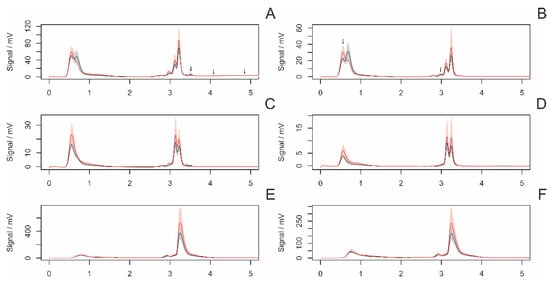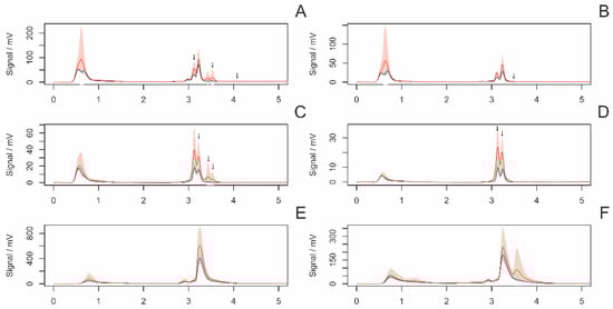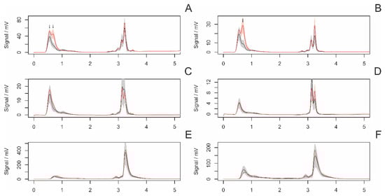 The average chromatograms of extracted chemical substances from the surface of fibers in adult (red) and subadult (black) females, along with their 95% confidence intervals. The settings of the detectors were as follows: (A)—AD 215 nm, (B)—AD 250, (C)—AD 280 nm, (D)—AD 340 m, (E)—FD 360 nm (ex. 250 nm), (F)—FD 360 nm (ex. 280 nm). The gray area represents a 95% confidence interval. Arrows indicate significant peaks in the intergroup comparison.