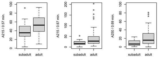 A comparison (boxplots) of statistically significant (p < 0.05) peaks in samples of draglines from adult and subadult females. The y-axis represents the signal of individual peaks. Labeling of peaks: method/retention time.