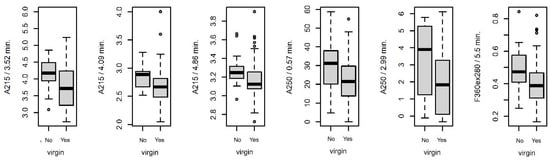 A comparison (boxplots) of statistically significant (p < 0.05) peaks in samples of draglines from virgin and nonvirgin females. The y-axis represents the signal of individual peaks. Labeling of peaks: method/retention time.