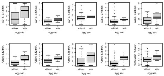 Comparison (boxplots) of statistically significant (p < 0.05) peaks (p < 0.05) in dragline samples from females with and without eggsacs. The y-axis represents the signal of individual peaks. Labeling of peaks: method/retention time.