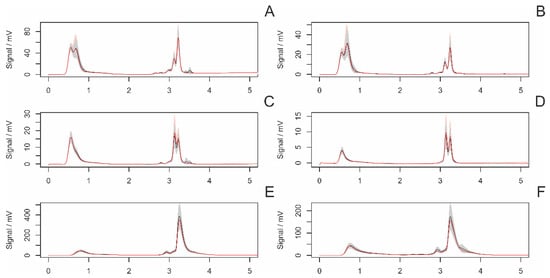 The average chromatograms of extracted chemical substances from the surface of fibers in hungry (red) and fed (black) females, along with their 95% confidence intervals. The settings of the detectors were as follows: (A)—AD 215 nm, (B)—AD 250, (C)—AD 280 nm, (D)—AD 340 m, (E)—FD 360 nm (ex. 250 nm), (F)—FD 360 nm (ex. 280 nm).