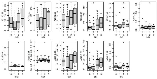 Comparison (boxplots) of statistically significant (p < 0.05) peaks in dragline samples from females with different sexual excitation index (SEI). The y-axis represents the signal of individual peaks. Labeling of peaks: method/retention time.