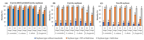 With the exception of the L2 stage of S. frugiperda developing on non-Bt soybean sprayed with 50% of the field label dose of thiodicarb (64.6% mortality), all other Spodoptera species presented >88.6% mortality when exposed to either dose of thiodicarb, differing significantly from those that developed on unsprayed non-Bt leaves (<19% mortality) (F = 272.14–190.82; df = 2, 18; p < 0.0001 for S. cosmioides; F = 380.34–236.36; df = 2, 18; p < 0.0001 for S. eridania; F = 344.46–361.43; df = 2, 18; p < 0.0001 for S. albula) (Figure 2C).