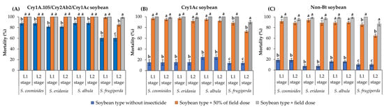 Lethality of three soybean types with and without flubendiamide spray against L1 and L2 larvae of Spodoptera species after 10 d of exposure. Within each group of bars (representing a given species and larval stage), values (±SE) with the same letter are not significantly different as determined by the LSMEANS statement using the Tukey–Kramer test at p > 0.05.