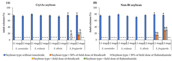 Adult eclosion (%) of Spodoptera species exposed to soybean types with and without insecticide spray. Within each group of bars (representing a given species and larval stage), values (±SE) with the same letter are not significantly different as determined by the LSMEANS statement using the Tukey–Kramer test at p > 0.05. An asterisk (*) indicates that no insects survived until adulthood.