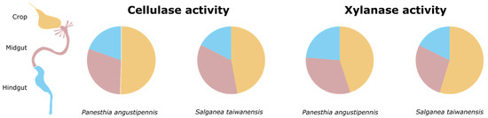 Proportion of cellulase and xylanase activity in the lumen of the gut regions of Panesthia angustipennis and Salganea taiwanensis. The legend is a color-coded generalized schematic of the panesthiine gut, indicating the regions sampled for the enzyme assays.
