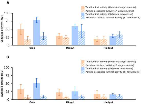 Our study provides compelling evidence for the significant roles of the luminal fluids played by all three gut regions in the digestion of cellulose and xylan in Panesthia angustipennis and Salganea taiwanensis. While the luminal fluid in the crop contributes the most to this process, housing cellulase activities of 79.97 ± 8.86 mU (S. taiwanensis) and 50.60 ± 16.26 mU (P. angustipennis) and xylanase activities of 51.47 ± 14.72 mU (S. taiwanensis) and 32.83 ± 14.50 mU (P. angustipennis) (Figure 1; Tables S1 and S2), the midgut plays a lesser yet notable role. Specifically, our results reveal that the luminal fluid in the midgut of S. taiwanensis houses approximately 60.21 ± 6.26 mU of cellulase activity and 10.44 mU of xylanase activity (Figure 2A,B; Tables S1 and S2). In comparison, the midgut of P. angustipennis contains around 29.95 ± 7.77 mU of cellulase activity and 22.86 ± 10.02 mU of xylanase activity. Furthermore, the luminal fluid in the hindgut of S. taiwanensis houses approximately 29.76 ± 5.07 mU of cellulase activity and 16.65 ± 2.79 mU of xylanase activity, while that in the hindgut of P. angustipennis houses about 19.61 ± 7.45 mU of cellulase activity and 17.30 ± 10.58 mU of xylanase activity.