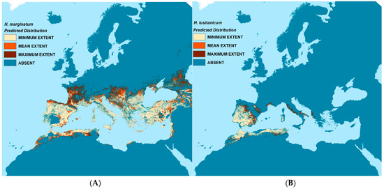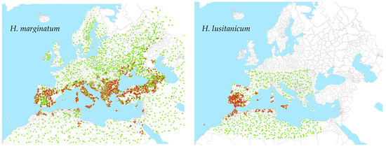 Predicted vector distribution maps. Left (A): H. marginatum; Right (B): H. lusitanicum.