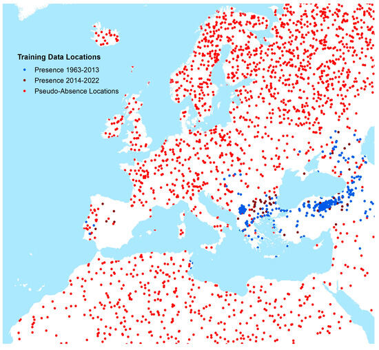 These methods require approximately equal numbers of presence and absence points to be offered to each modelling run. The occurrence data were obtained primarily from VectorNet [15] shown in Supplementary Figure S1, supplemented by approximately 60 records for each species from the Global Biodiversity Information Facility (GBIF, https://www.gbif.org, accessed on 15 October 2022). The VectorNet data consisted of both point and polygon data, differentiated into present, absent, and introduced categories. This last category represents records of temporary presence—often from migratory birds—and are not indicative of established populations. These records were therefore discarded. Five points were defined for each polygon and assigned as present or absent according to the polygon status, and to these, any point data from either VectorNet or GBIF were added.