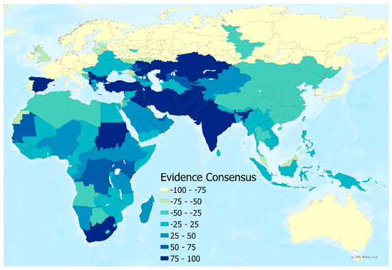 An evidence consensus score was derived from a series of evidence types for the presence or absence of CCHF disease in humans at the national level. This information was used to rank a country from −100 (consensus on absence) to +100 (consensus on presence) using the same methodology as described in Messina et al. [20] and more recent reports of CCHF transmission since the publication of that study (see Figure 3). Finally, to represent the environmental conditions in locations where human disease has not been reported, 5000 background points were randomly generated and weighted based on these values. More background absence points were assigned to areas with a high consensus on absence, and fewer were assigned to areas with a high consensus on presence.