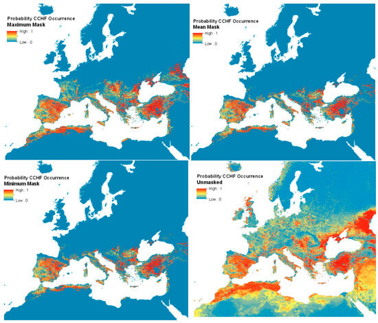Figure 5 shows the resulting mean predictions for CCHF probability of occurrence (ranging 0–1), displayed with masks of minimum, maximum, and mean predicted vector presence (where at least one of the modelled probability values for either vector’s presence was greater than or equal to 0.5), as well as the unmasked version. Supplementary Figure S5 shows the full global modelled distribution (beyond Europe; unmasked). Uncertainty estimates for each pixel were possible from the ensemble approach (by using the interquartile range of all 50 predictions) and are shown in Supplementary Figure S6.