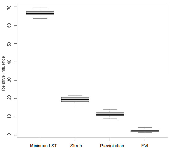 The proportional influence of covariates toward the probability predictions in the ensemble of models is shown in Figure 6, with the total proportion equalling 100 percent. The average Area Under the Curve (AUC) across all models was 0.74 (range 0.67–0.79). Land surface temperature was by far the greatest contributor to the models, followed by precipitation, shrub land cover, and then EVI.