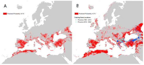 Maps of high predicted CCHF suitability. (A) Left: areas with predicted probability of disease ≥0.75 masked to maximum predicted vector extent; (B) Right: same as left but with recorded occurrence points and no vector mask.