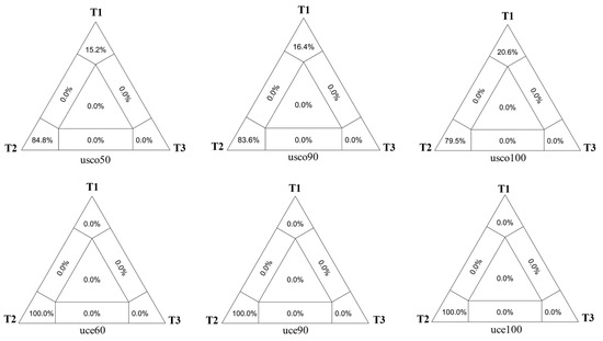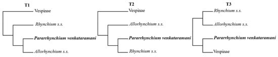 Following the phylogenetic analyses, one node showed inconsistent results with analyses based on information from individual genes (ASTRAL and partitioned ML) and analyses of the different matrices using profile mixture models (GHOST and PMSF). Gene tree heterogeneity, such as incomplete lineage sorting, is a known source of erroneous inference in summary coalescent methods [52]. We suspected that the discordance between our results was due to uninformative genes in gene-wise partitioning and gene trees. First, using likelihood-mapping (LMAP) [53] as implemented in IQ-TREE, we evaluated whether individual genes contained sufficient information to distinguish between different topologies at the two competing nodes. For the recalcitrant node, four clusters of taxa were defined (Vespinae, Rhynchium s.s., Pararhynchium venkataramani, and Allorhynchium s.s.) (Figure 1). The topologies 1 and 2 were of interest; the topology 3, which was equally conceivable given the unrooted tree with four clusters but had not been in any of the earlier analyses, could have been recovered. Then, we tested the resultant two alternative topologies (T1, T2) with the matrix UCE90 using approximately the unbiased (AU), weighted Kishino–Hasegawa (WKH), and weighted Shimodaira–Hasegawa (WSH) tests under the partitioned model ‘-m GTR + I + G’ in IQ-TREE: T1, (Allorhynchium s.s. + Pararrhynchium venkataramani) + remaining taxa; T2, Allorhynchium s.s. + (Pararrhynchium venkataramani + remaining taxa). The tree estimated from previous ASTRAL inference on matrix UCE90 was used as the guide tree and the starting tree.