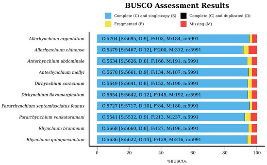 Here, we sampled 10 species of the Rhynchium genera group with two species for each of the genera Rhynchium, Allorhynchium, and Pararrhynchium, and four species of the two subgenera Anterhynchium and Dirhynchium in the genus Anterhynchium (detail information is shown in Table 1, more information see Table S1 in the Supplementary Materials). Specimens of the 10 species were netted, smothered in collection tubes, immersed in 95% ethanol, and stored at −20 °C at the Institute of Entomology and Molecular Biology, Chongqing Normal University. The head and gaster were removed to reduce contamination of the intestinal flora; and the remaining tissue was sent to Novogene Bioinformatics Technology Co., Ltd. (Tianjin, China) for sequencing. Genomic DNA was extracted and purified using the DNeasy DNA Extraction Kit (Qiagen). The qualified libraries were pooled and sequenced on Illumina platforms with PE150.