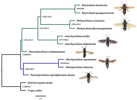 The subfamily Eumeninae (Hymenoptera: Vespidae) is a large group of fierce predatory insects that prey mainly on the larvae of Lepidoptera pests and can be used for biological control [1,2]. It contains seven genera with roots rhynchium worldwide, including Allorhynchium van der Vecht, 1963, Anterhynchium de Saussure, 1863, Emeryrhynchium Gusenleitner, 2007, Gibberhynchium Gusenleitner, 2002, Pararrhynchium de Saussure, 1855, Rhynchium Spinola, 1806, and Xenorhynchium van der Vecht, 1963. They are restricted to the Old World [3,4], with four, Rhynchium, Anterhynchium, Pararrhynchium and Allorhynchium, found in China. Hereafter, we refer to these four genera as the Rhynchium genera group in this study. The Rhynchium genera group has similar morphology, with a body size ranging from 8.9 mm to 15.1 mm, relatively stout, and slightly narrower first than the second gastral segment [5,6,7,8,9,10,11,12,13,14]. Because of the highly similar morphologies of these genera, it is sometimes challenging to tell them apart from each other, and therefore delineating their relationships is a significant exploration.