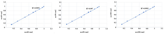 All the runs of data matrices have ESS values greater than 200, and a strong correlation (R2 > 0.99) of the convergence plots indicates good convergence between parallel runs (Figure 5). The MCMCTree results (Figure 6) show that the most recent common ancestor (MRCA) of the Rhynchium genera group was inferred to be the Cretaceous (95.74 million years (Ma), 83.09–107.58 at 95% highest posterior density (HPD)). The crown groups of Allorhynchium and Pararrhynchium septemfasciatus feanus originated during the Cretaceous–Paleogene (71.93 Ma, 41.27–96.98); the crown age of Allorhynchium was estimated at the Paleogene–Quaternary (13.98 Ma, 1.42–33.35); the origins of Pararrhynchium and the clade containing Dirhynchium, Rhynchium, and Anterrhynchium occurred during the Cretaceous (88.35 Ma, 76.29–100.04); the origins of the clade comprising Dirhynchium and Rhynchium also occurred during the Cretaceous–Paleogene (71.47 Ma, 62.96–80.86); the crown age of Rhynchium falls at the Paleogene (60.24 Ma, 59.15–61.54), consistent with the timing of the fossil node; Dirhynchium and Anterrhynchium occurred during the Paleogene–Quaternary (14.57 Ma, 1.11–36.5; 13.98 Ma, 1.42–33.35, respectively).