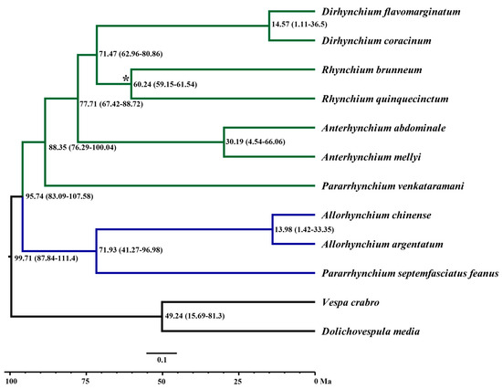 The Rhynchium genera group divergence time estimation performed by using MCMCTree on the ASTRAL topology. Node numbers and node bars represent 95% CIs of the estimated divergence times integrated from all MCMC runs. Asterisk mark node constrained with the fossil.