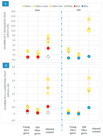No differences were recorded for the different colored sticky traps used for the capture of N. campestris adults (Figure 1) in the secular olive grove, where the population was very low (Table 1). However, the captures were higher for the yellow sticky traps than for the other traps in the 20-year-old olive grove and in the almond orchard (Table 1).