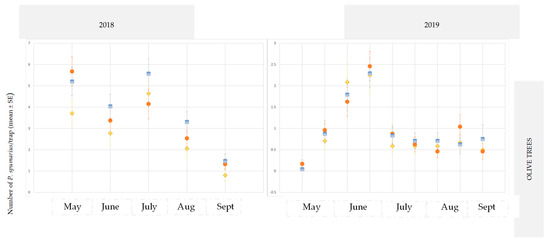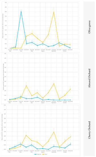 No difference was observed between the two sampling methods (traps versus sweep nets) in the remaining periods, probably because adults move continuously from olive, almond, and cherry canopies, to shrubs or other plants in their search for suitable shoots for sustenance and/or for plants as shelter (high or low temperatures, and adequate humidity conditions) [17,23,36].
