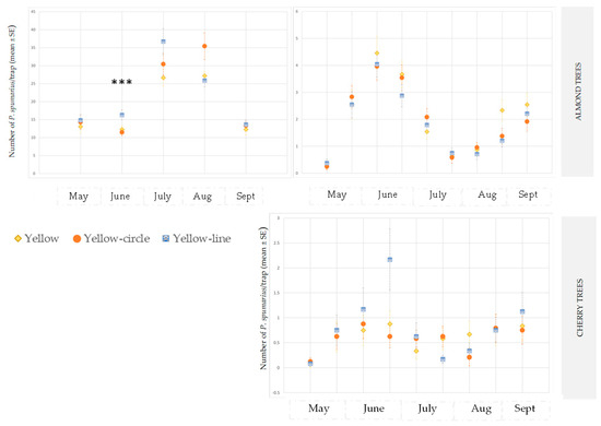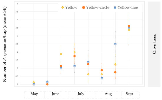 When analyzed separately, the yellow-colored traps were found to be more attractive for P. spumarius in all the plots, in the young and old olive groves and in the almond orchards, than the other colored sticky traps. On the other hand, no difference was recorded between the different tested yellow sticky traps (plain, yellow with a circle pattern, and yellow with a line pattern) located in the olive groves. The yellow traps with a line pattern captured a significantly larger number of adults of P. spumarius adults during the month of July in the almond orchards (Table 1).