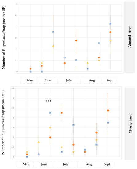 Captures on yellow sticky traps of adults of Philaenus spumarius in the olive groves, and in the almond and cherry orchards in site B during 2019. *** Significant at p < 0.0001.