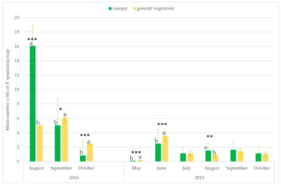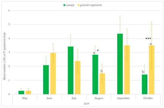 The number of captures on the traps placed at the ground level or hung on the tree canopies varied throughout the seasons. Significantly higher captures were recorded on traps placed near the ground vegetation in the first period of adult emergence (ANOVA: May: F = 26.59; df1 = 1, df2 = 118, p < 0.00001; June: F = 13.06; df = 1, p = 0.00004) and in September–October, when spittlebugs return to herbaceous ground vegetation (ANOVA: September site A 2018: F = 6.08; df1 = 1, df2 = 118, p = 0.0146; October site A 2018: F = 69.62; df1 = 1, df2 = 118, p < 0.00001; October site B 2019: F = 13.88; df1 = 1, df2 = 70, p = 0.0005). However, in August, most of the individuals were caught in traps placed on the tree canopies (ANOVA: site A 2018: F = 175.40; df1 = 1, df2 = 118, p < 0.00001; site A 2019: F = 6.79; df = 1, df2 = 70, p = 0.01; site B 2019: F = 6.01; df = 1, df2 = 70, p = 0.0174) (Figure 4 and Figure 5).