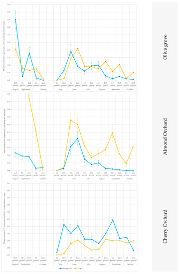Instead, no differences in the average number of specimens/traps were observed among the crops from May to June in site B. However, a variation in the population density was recorded in the following months, with larger populations on olive trees than on the other plant species. In October, the largest number of captures was recorded in the cherry orchard, and this was followed by the almond orchard and the olive groves (Table 3).