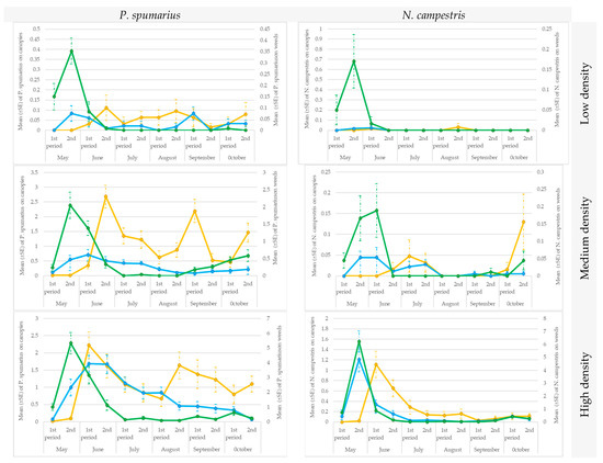 In the 6 experimental fields in which the presence of N. campestris juveniles was recorded, the number of specimens per unit ranged from 0.01 ± 0.00 to 29.4 ± 4.73 nymphs/0.25 m2. These 6 fields were then grouped into two categories: “with a low population density” for average values of 0.13 ± 0.087 nymphs/0.25 m2 and “with a high population density” for average values of 17.5 ± 4.4 nymphs/0.25 m2.